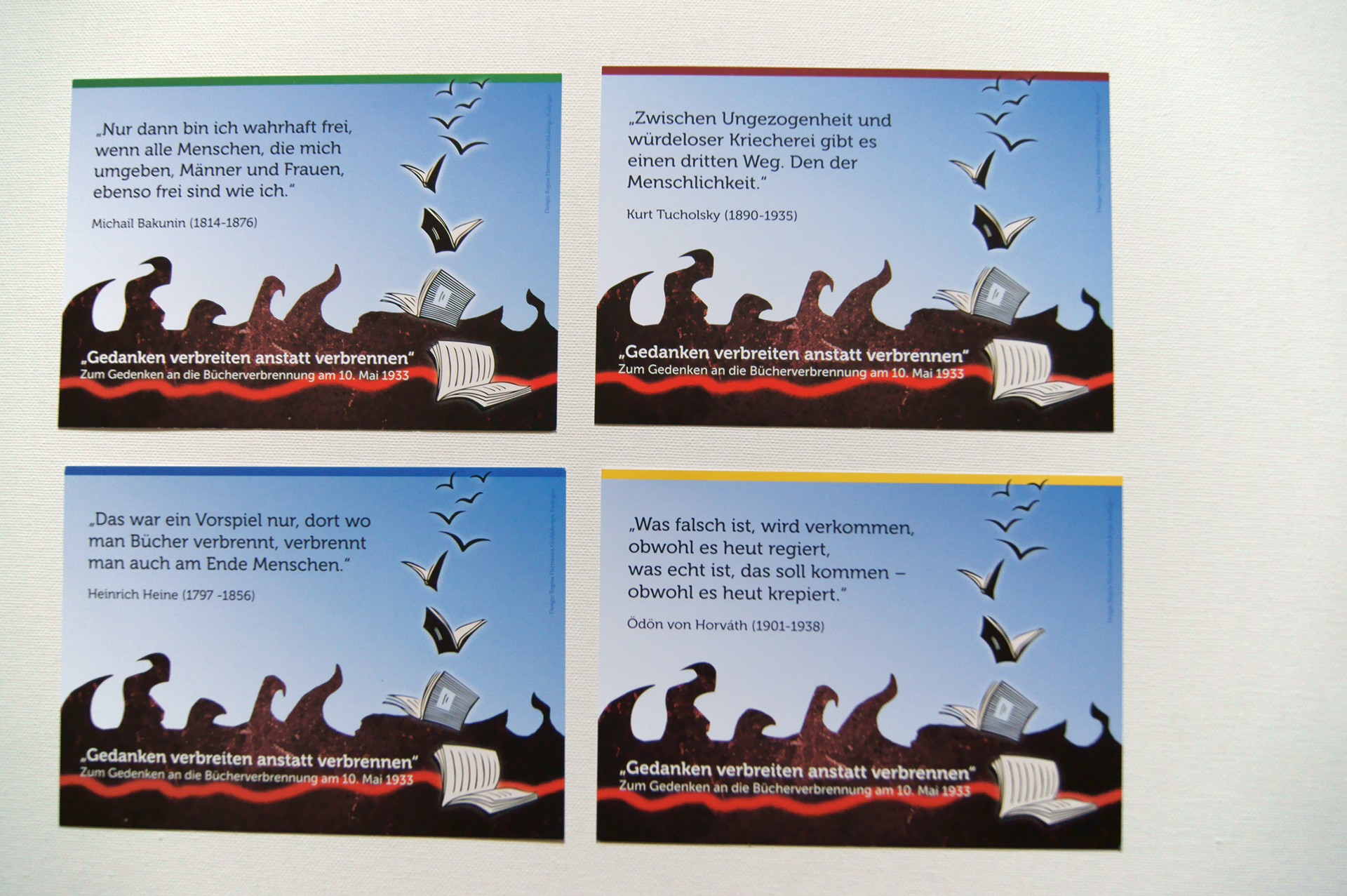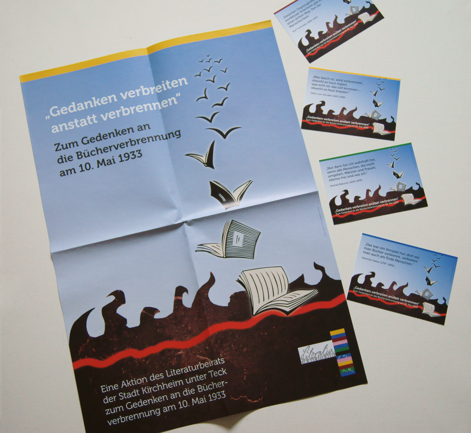 Postkarten und Plakatserie für eine Veranstaltung zum Gedenken an die Bücherverbrennung von 1933